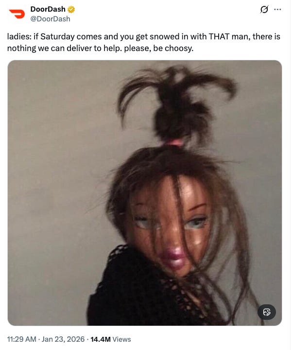 A few days ago, DoorDash went viral on X with a witty post about the snowstorm. They playfully warned women to be extra careful with the man they decide to cuddle up with while snowed in. The running internet joke on black Twitter for years is that these situations may require a plan B at some point. DoorDash obviously didn’t say this, but that’s exactly what the post implied.